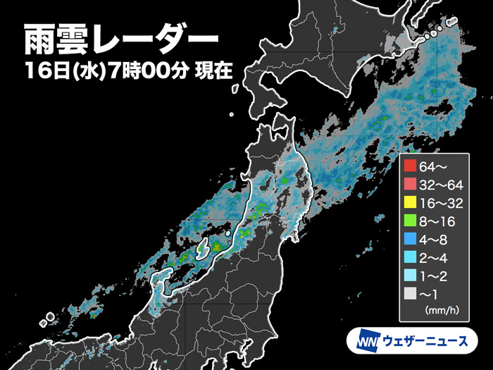 前線に伴う雨雲が今朝は東北から北陸、山陰にかけてかかっていて、7時までの1時間に秋田県仙北市の桧木内で12.5mm、岩手県雫石町の葛根田で11.5mmの強い雨を観測しました。石川県輪島市の門前でも6.0mmと本降りの雨となっています。