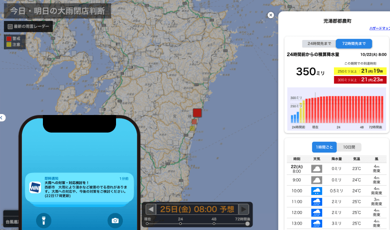 大雨閉店判断(大雨リスク対策)では、宮崎県内の複数の地点で300mm以上の積算雨量が予測されていました。宮崎都西都市や都農町では、警戒判定基準値上回るような大雨となっていたことがわかります。PUSH通知をオンにしていただいているお客様には、警戒判定となったことがスマホへ通知されます。このような大雨予測の情報を活用することで早めのリスク対策を行うことが可能となります。