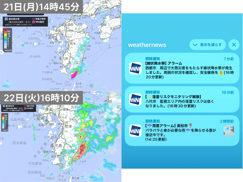「雨雲レーダー&落雷」メニューでは、実際に解析された線状降水帯が捉えられました。記録的短時間大雨情報が発表された鹿児島県の大隈半島付近では、21日の14時台にピンク色で表される線状降水帯リスクの解析が表示されていたことがわかります。また、翌日22日の16時台には、宮崎県南部で気象庁の線状降水帯が解析されました。赤い丸印で示されたエリアは実際に気象庁の解析で線状降水帯と判定された部分です。