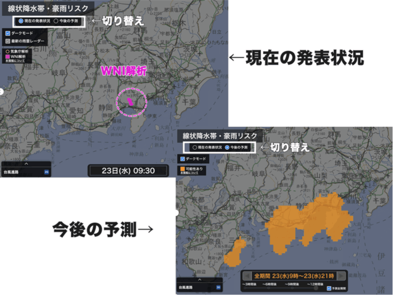 今回リリースした「線状降水帯・豪雨リスク」では、現在の発表状況と今後の予測を切り替えてご確認いただけます。実際の解析だけでなく、予測の情報を組み合わせながら、早めの防災対策・行動にご活用ください。
