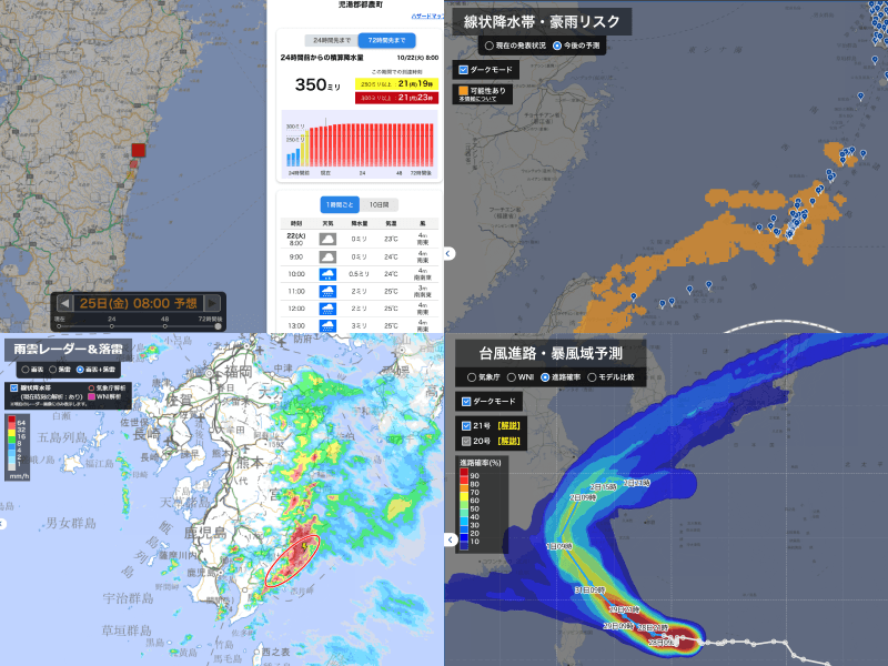 ウェザーニューズの解析では九州南部の大雨を捉えていました。これらの線状降水帯やそれに伴う豪雨リスクに注目しご活用いただくために、10月25日PC版には新たに「線状降水帯・豪雨リスク」がリリースされ、ご覧いただけるようになりました。