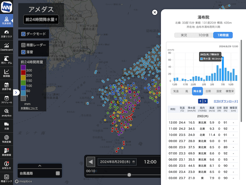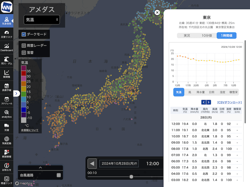 気象庁のアメダスは、全国約1300地点、10分ごとの気温・風向風速・降水量・湿度のほか、雪の多い地域を中心に積雪深の観測が行われています。今回のリリースでは、10分ごとに配信されるアメダスデータをマップに表示するともに、地点をクリックするとグラフや一覧がご確認いただけるようになっています。一覧データは、CSVファイルとしてダウンロードも可能です。