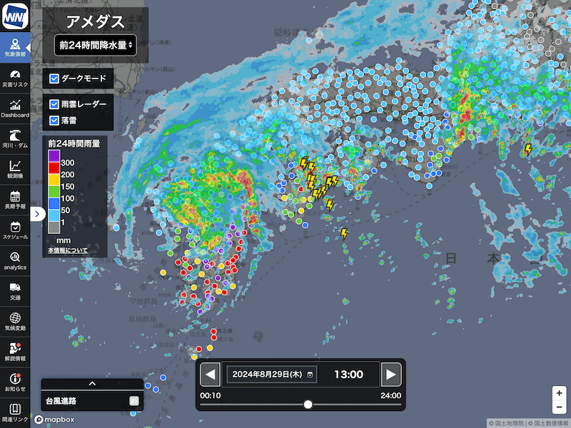 雨雲レーダー&落雷も重ね合わせ出来る!