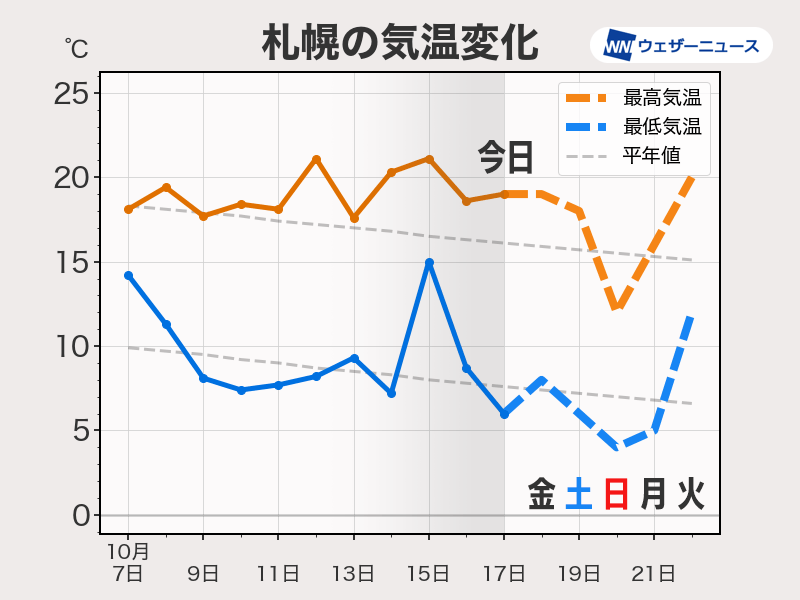 強い寒気の南下に伴って体感も大きく変化します。19日(土)の午後から気温は下がる一方で、20日(日)は晴れてきても気温があまり上がりません。札幌では予想最高気温が12℃と11月上旬並みに相当します。今季これまでで一番低い最高気温になりそうです。