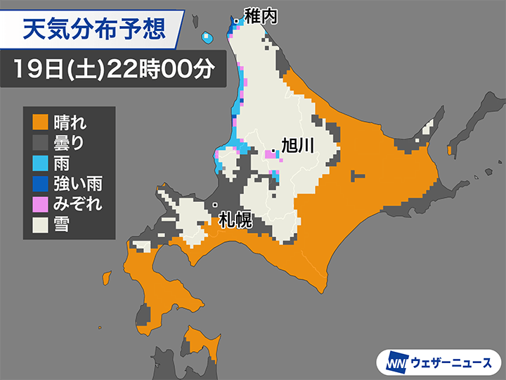 前線が通過したあとも天気はすっきりとは回復せず、上空の寒気の影響で日本海で雲が発生し、北海道の日本海側では19日(土)午後も曇りや雨の天気となります。