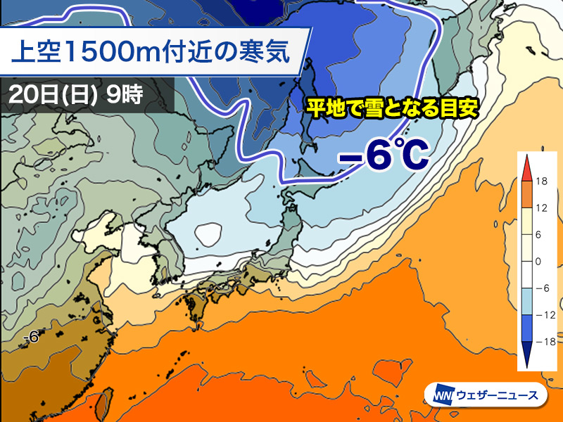 寒冷前線が通過した後は西高東低、冬型の気圧配置に移行します。寒冷前線の西側には上空1,500mで0℃~-6℃というこの時期としては非常に強い寒気が控えていて、19日(土)午後から20日(日)にかけて日本列島の上空に南下。北海道の上空には平地で雪の降る目安とされる-6℃以下の寒気が南下します。