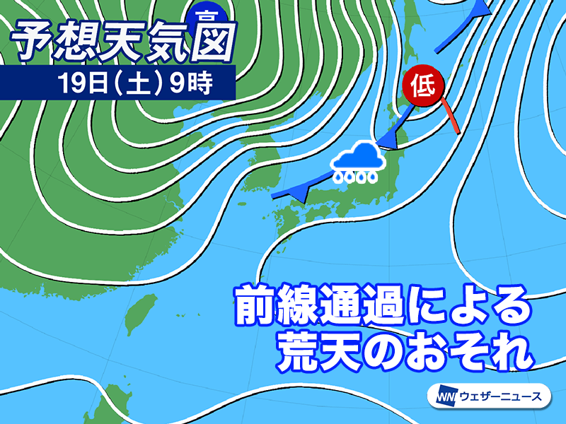 19日(土)は低気圧が日本海から北海道を経由してオホーツク海に移動します。この低気圧から伸びる寒冷前線が日本列島を通過します。低気圧前線に近い北海道や北陸、西日本日本海側では朝から本降りの雨となり、前線の南下と共に雨のエリアは徐々に南から東に拡大する予想です。