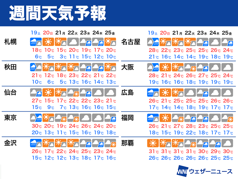 前線の通過が遅い関東では気温が下がり始めるタイミングが遅く、明日19日(土)は30℃まで気温が上がる予想。真夏日になれば観測史上最も遅い真夏日になります。ただ、翌日20日(日)の予想最高気温は20℃まで下がり、週明け21日(月)には11月上旬並みの19℃となります。