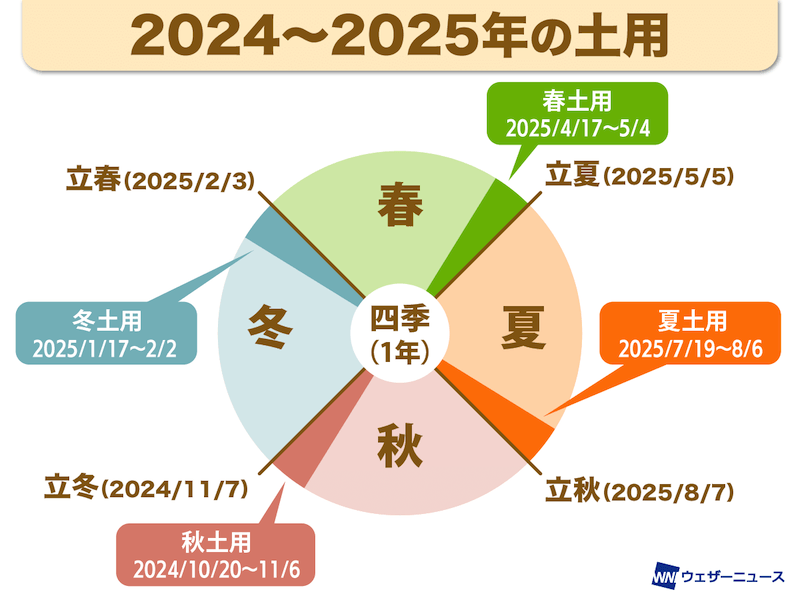 ちなみに、2025年の場合は立春は2月3日、立夏は5月5日、立秋は8月7日、立冬は11月7日のため、春土用は4月17日~5月4日、夏土用は7月19日~8月6日、秋土用は10月20日~11月6日、冬土用は1月17日~2月2日となります。