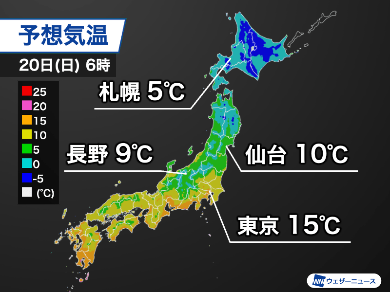 朝の気温も今朝より大幅に下がり、札幌では10℃以上低い5℃の予想です。暖房をつけたくなる方もいるかもしれません。北海道の内陸部では氷点下の所も多く、凍結が心配です。