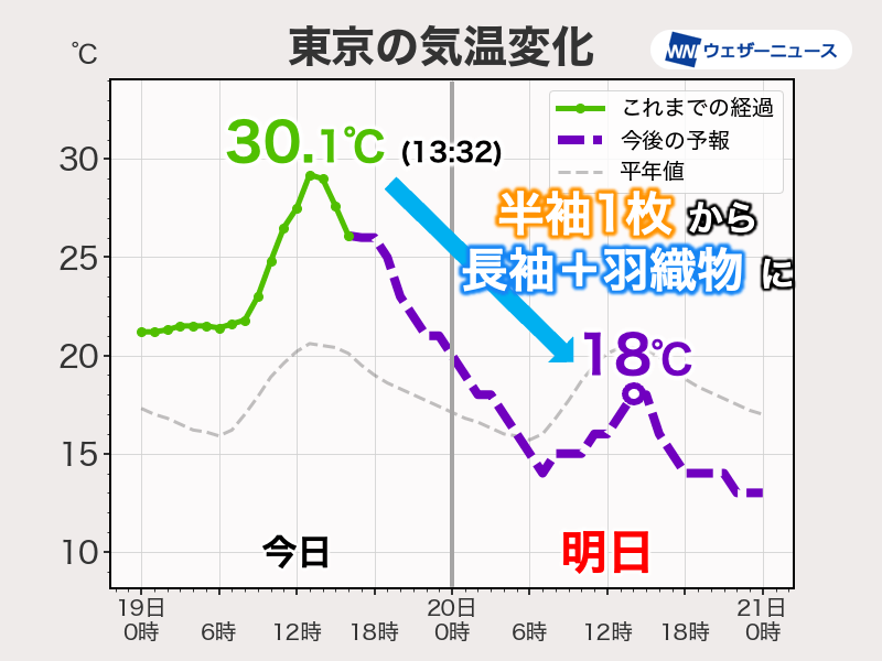 東京の気温変化を見ると、明日の予想最高気温20℃は、日付が変わってすぐに出ることがわかります。昼間は18℃と、11月上旬並みの気温になる予想です。半袖1枚で過ごせた夏の暑さから、一気に長袖と羽織物が必要な秋本番の体感になります。体調を崩さないようお気をつけください。