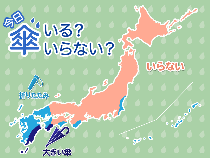 九州と中国地方の西側、四国や紀伊半島の一部でも雲が広がりやすく、雨の降ることがあります。東風の影響をうける茨城や千葉の沿岸でも弱い雨の可能性があります。折りたたみ傘があると安心です。
