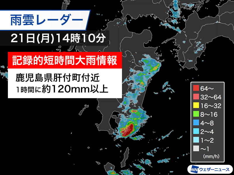 鹿児島県で1時間に120mm以上の猛烈な雨 記録的短時間大雨情報