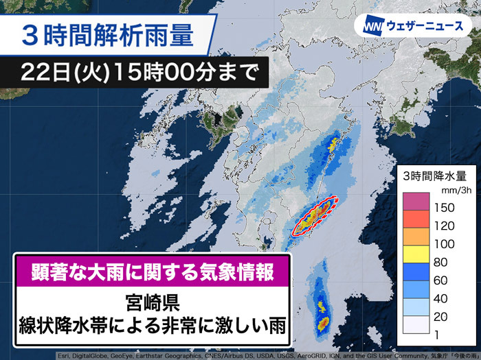 宮崎県南部平野部付近では非常に激しい雨が降り続き、多いところでは3時間で150mm以上の雨が降ったとみられます。周辺では土砂災害や河川の氾濫が発生するおそれが急激に高まっています。