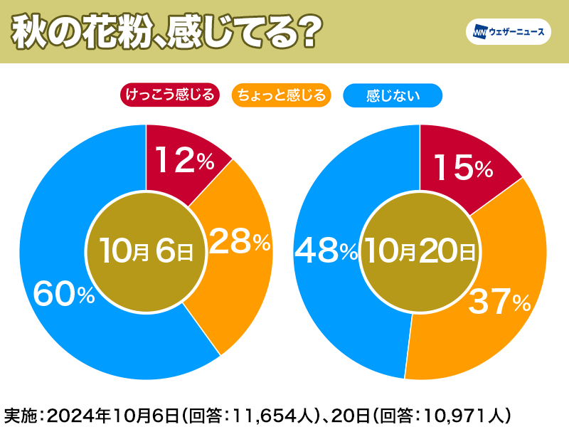 10月6日に実施した調査では秋の花粉を感じている方が40%(「けっこう感じる」と「ちょっと感じる」の合計)、10月20日の同調査では52%と秋の花粉を感じている方が10ポイント以上増加していました。