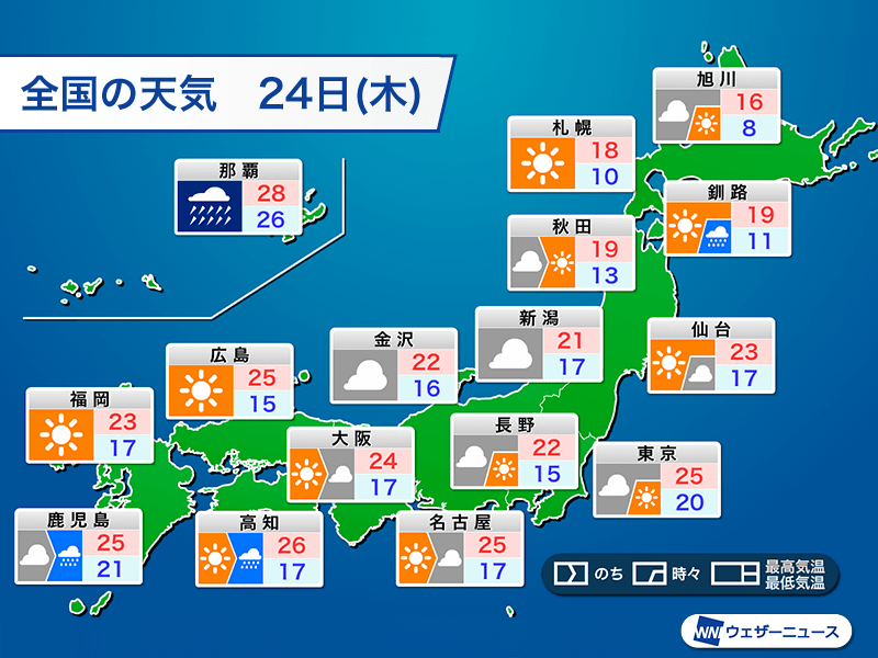 明日24日(木)は北寄りの風に変わる所が多く、晴れても今日ほどは気温が上がりません。最高気温は大阪市で今日に比べて5℃低い25℃、金沢市は6℃も低い22℃の予想となっています。