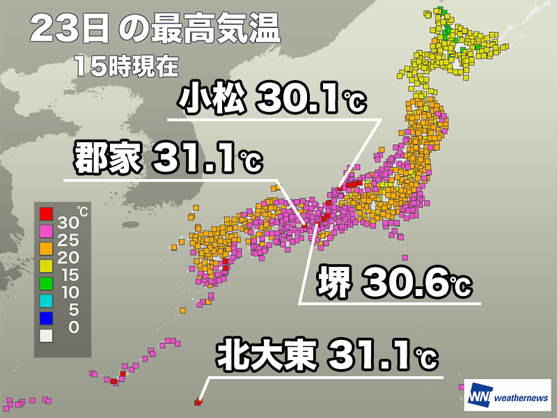 15時00分までの最高気温が全国で最も高かったのは兵庫県淡路市・郡家と沖縄県北大東村で31.1℃まで上昇。郡家は10月として観測史上1位を更新しました。そのほか、大阪府堺市で30.6℃、石川県小松市で30.1℃と統計開始以来、最も遅い真夏日になっています。
