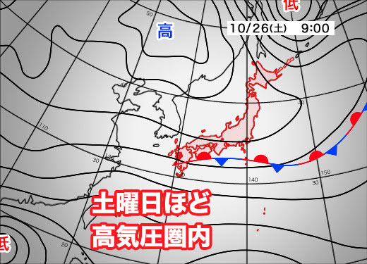 南海上の前線の影響を受けて、太平洋側ほど雲が広がりやすくなります。大きな天気の崩れはなさそうですが、丹沢や伊豆半島周辺、南アルプス南部や中央アルプス南部など南のエリアほどにわか雨の可能性があります。遅い時間ほど降りやすくなるので、早出早着を心がけてください。