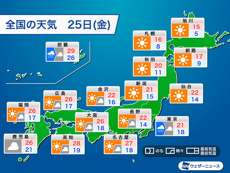 日差しがしっかり届くため、広い範囲で25℃以上の夏日になる見込みです。各地の最高気温は福岡市や大阪市で26℃、名古屋市は27℃まで上がる予想となっています。