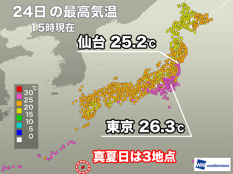 関東から東北南部の太平洋側は昨日23日(水)に流れ込んだ暖かな空気が残っていて、日差しが届いたことで気温が上昇しました。