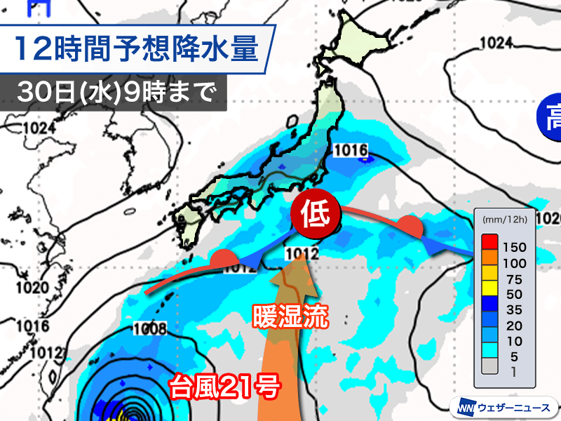 台風が沖縄の南に達する30日(水)頃は前線が本州の南岸に伸び、南東から湿った空気が送り込まれて雨雲が発達しやすくなる見通しです。