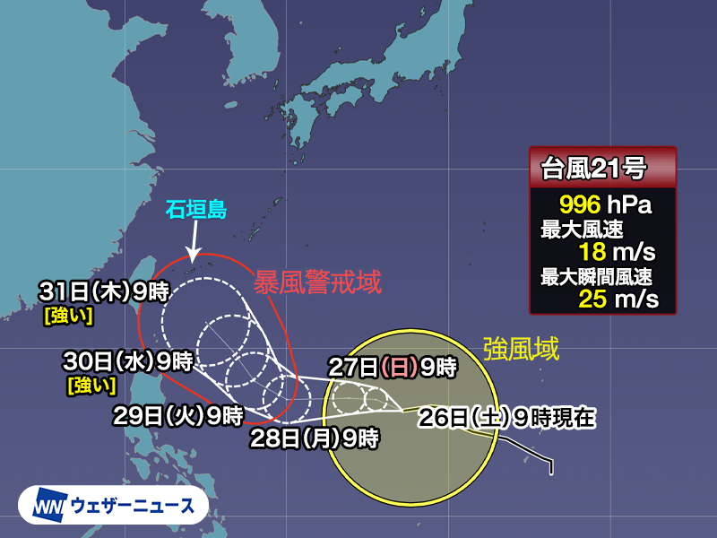 マリアナ諸島で発生した台風21号は、日本の南に張り出す高気圧の縁を沿うようにしばらくは西寄りに進みます。進路にあたる領域は海面水温が高く、少しずつ勢力を強める見通しです。来週29日(火)には暴風域を伴い、30日(水)には強い勢力にまで発達するとみられます。