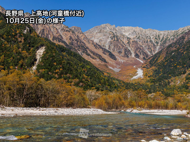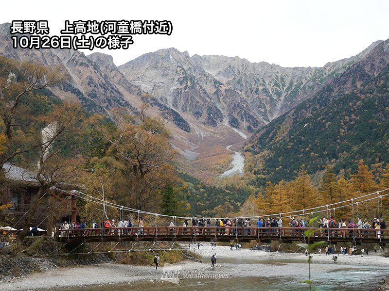 例年10月中旬頃から見頃を迎える長野県上高地(河童橋付近)では、ここ最近の冷え込みでようやく色づきが進み、例年より一週間以上遅れて見頃を迎えました。黄金色のカラマツが一帯を美しく染める人気スポットで、ウェザーニュースアプリの利用者からは週末の河童橋付近の様子が届いています。