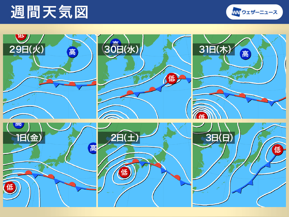 週明け以降は本州付近に秋雨前線が停滞する予想で、台風からの湿った空気が流れ込むと活動が活発になることが考えられます。特に29日(火)〜30日(水)や11月1日(金)〜3日(日)頃は雨雲が発達しやすくなる見通しです。