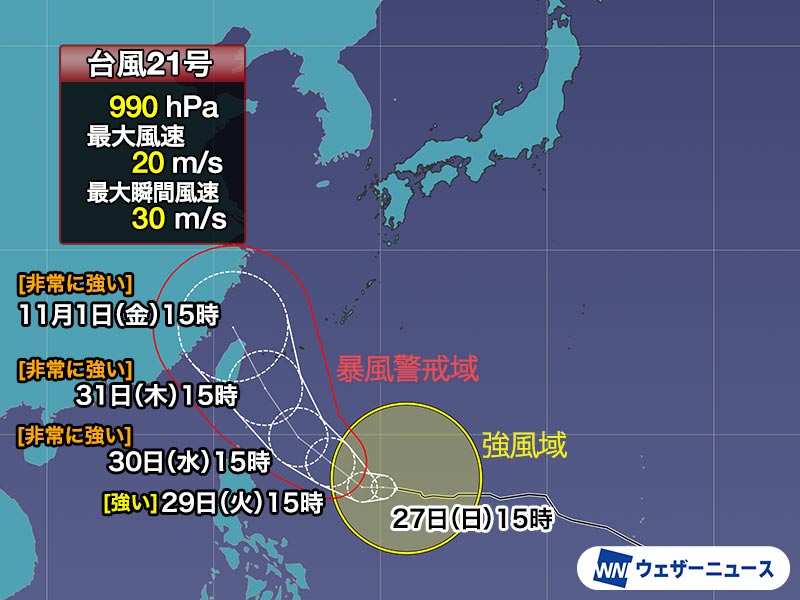 進路にあたる海域は台風の発達に適した環境になっているため、この先は急速に勢力を強める見込みです。明後日29日(火)までに暴風域を伴い、30日(水)には非常に強い勢力に発達する予想です。