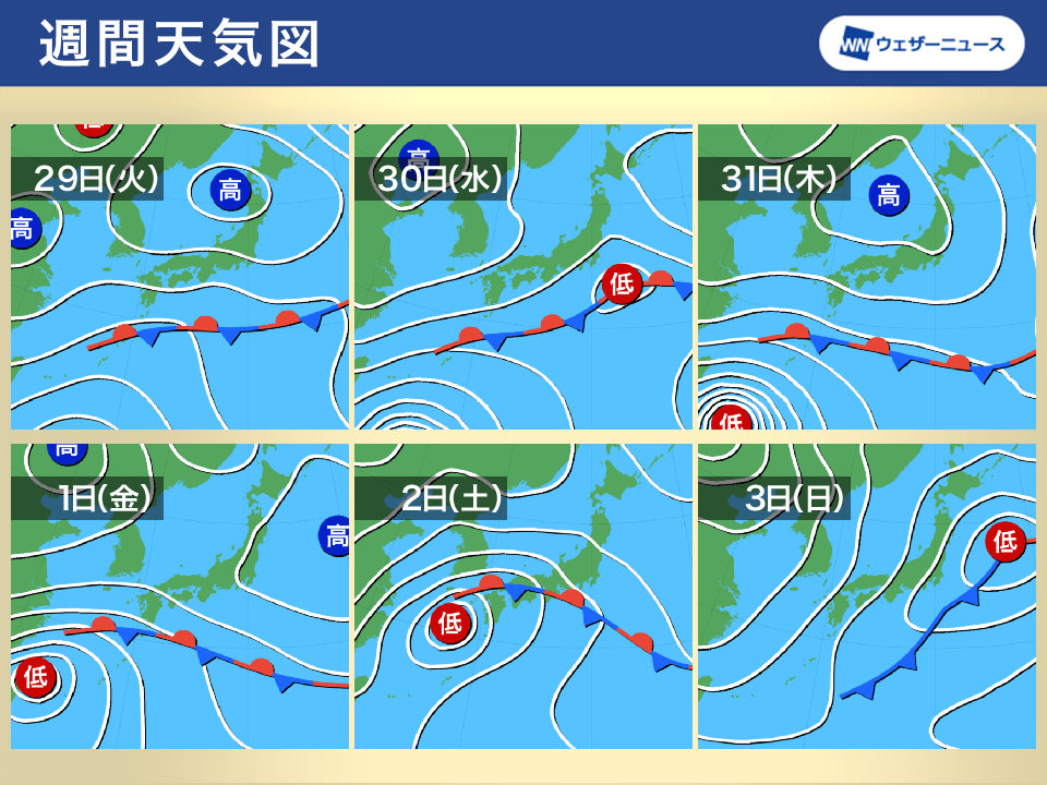 明日以降は本州付近に秋雨前線が停滞する予想で、台風や南の海上の高気圧からの湿った空気が流れ込むと活動が活発になることが考えられます。特に29日(火)〜30日(水)や11月1日(金)〜3日(日)頃は雨雲が発達しやすくなる見通しです。
