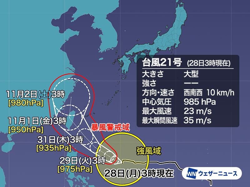 進路にあたる海域は台風の発達に適した環境になっているため、この先週中頃にかけて急速に勢力を強める見込みです。明日29日(火)には暴風域を伴い、31日(木)には中心気圧が935hPa、中心付近の最大風速が50m/sと非常に強い勢力にまで発達する予想です。
