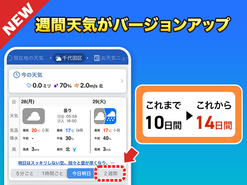 ピンポイント天気の週間天気が「2週間分」見れる