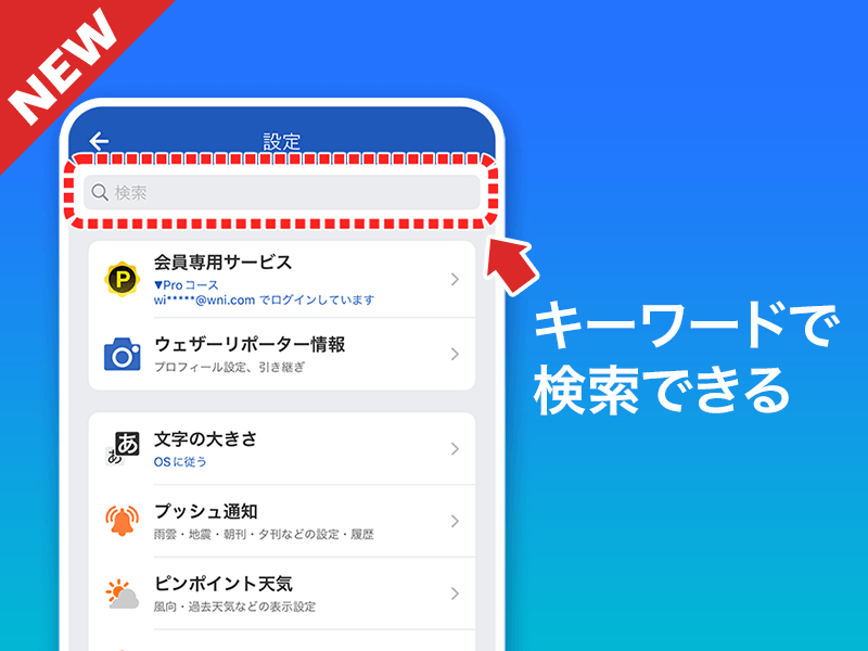 マイ天気の表示内容や、PUSH通知の設定を変更する際に、「アプリの設定」の上部にあるキーワード検索の機能を利用して頂くと、すぐに変更場所を見つけることができます。