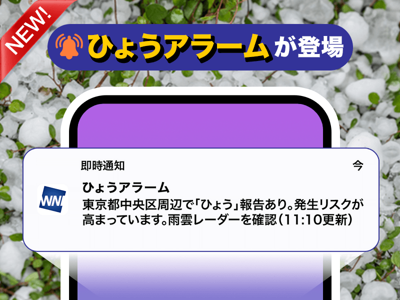 お天気アラーム(現在地連動)に雹(ひょう)の降る危険をお伝えする「ひょうアラーム」が加わりました。(会員メニュー)