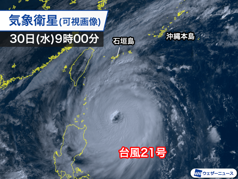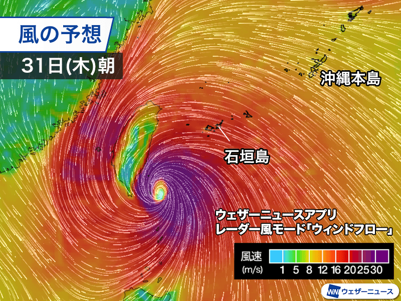 台風の中心は先島諸島から少し離れた所を通るものの、大型であることや猛烈な勢力で通過することから、風が強まります。昨日から瞬間的には20m/s前後の強風が吹いていて、明日には30m/s以上の暴風となる見込みです。