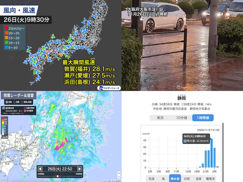 11月26日(火)、日本付近は複数の低気圧の影響を受け、天気が下り坂となりました。瞬間的には25m/sを超える暴風が観測され、一部地域に暴風警報が発表されました。