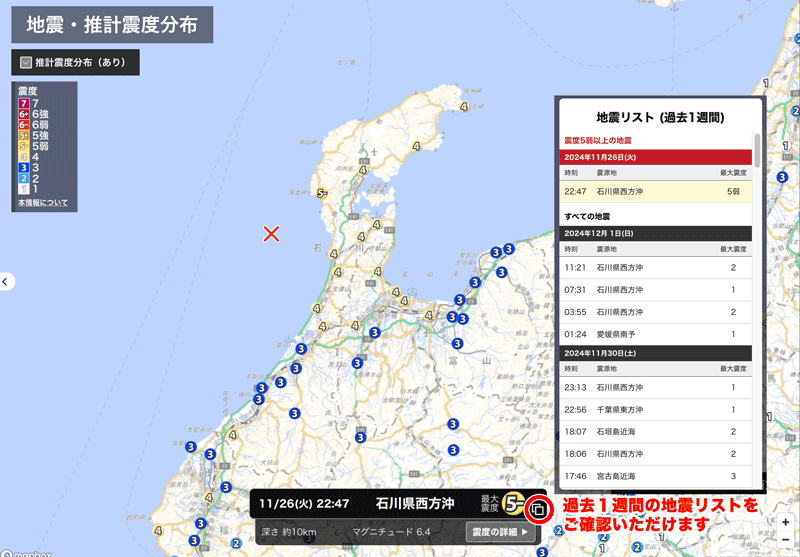 ウェザーニュース for businessの「地震・推計震度分布」メニューでは、リアルタイムな地震情報に加えて、過去1週間の地震リストもご確認いただけます。