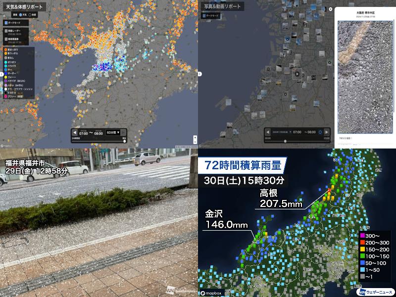 また、北陸地方では、長時間の降雨により72時間で100~200mmを超える降水量を記録した地点が相次ぎました。新潟県村上市高根で207.5mm、山形県鶴岡市荒沢で169.5mm、石川県金沢市で146.0mmなど広い範囲で100〜200mmの雨を観測しています。