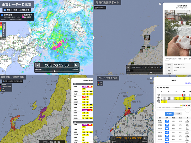 雹(ひょう)が降るリスクを「注意・警戒」の2段階でマップ上に表示しています。「警戒」は目先3時間内にリスクが高まる際に発表しますが、判定にはウェザーニュースアプリユーザーの皆様から寄せられる天気リポートも加味されています。