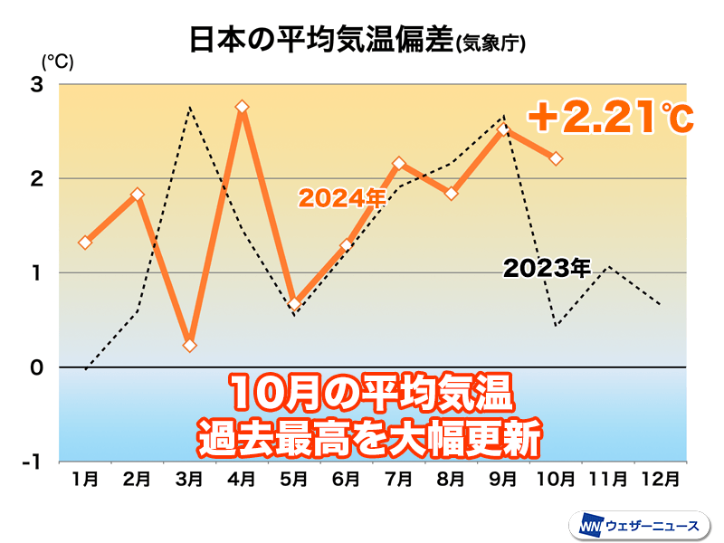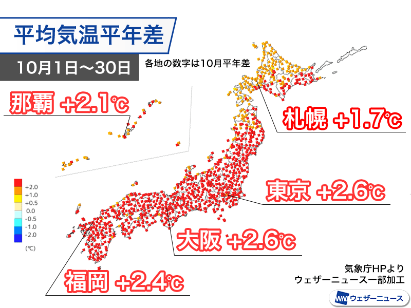 10月の平均気温は全国ほとんどの地点で平年より2℃以上高く、各地で観測史上1位の高さになりました。