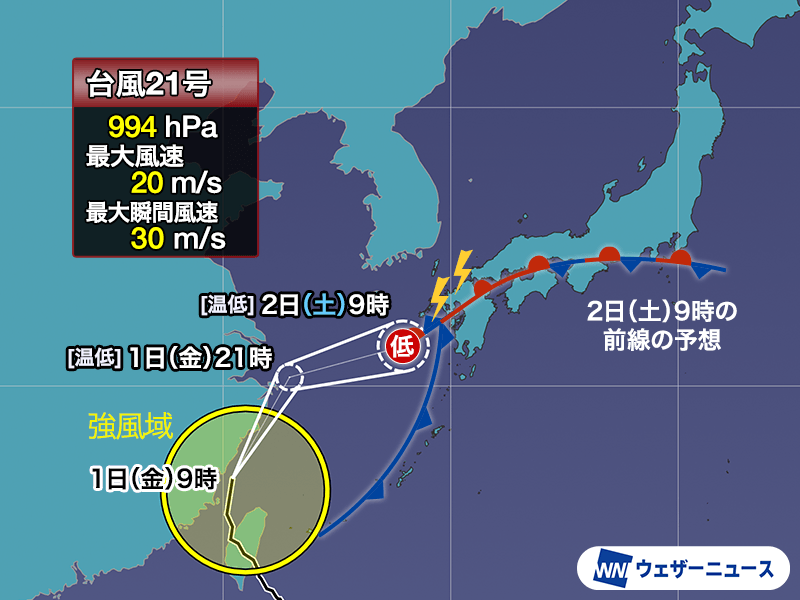 台風21号から変わる温帯低気圧は今夜遅くに九州の西に進み、この低気圧もしくはその前面に発生する別の低気圧が、明日2日(土)は前線に沿って西日本〜東日本を進む見込みです。
