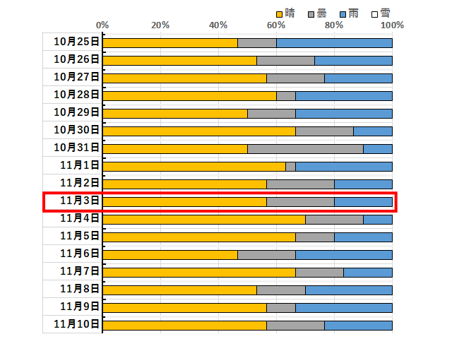 前後の日と比べてみると、11月4日は70%、5日は67%となっていて、文化の日は「晴れの特異日」とは言いづらくなっていることがわかります。