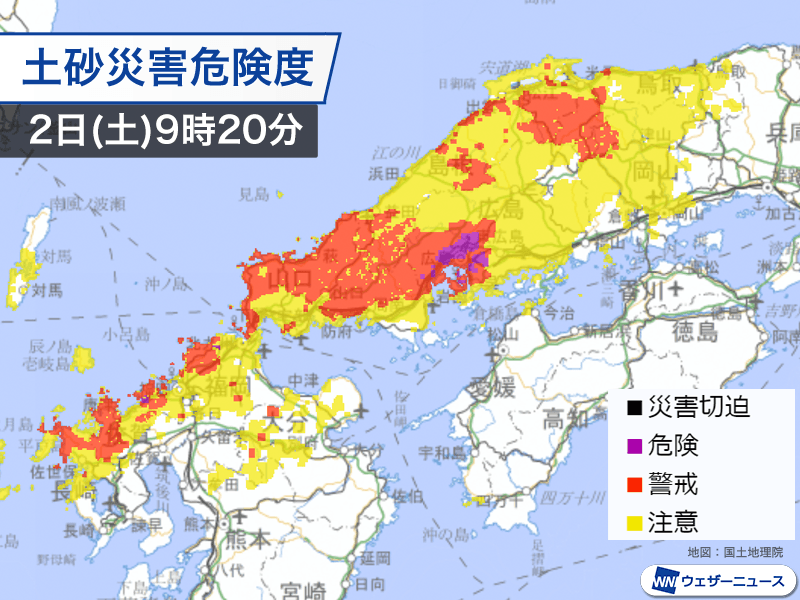 雨量の増加に伴い土砂災害の危険度が高まり、中国地方の広範囲が「警戒」を示す赤色、広島県を中心に「危険」を示す紫色の領域が広がっています。9時30分の時点で広島県と島根県、福岡県に土砂災害警戒情報が発表され、広島市などには避難指示が発令されました。