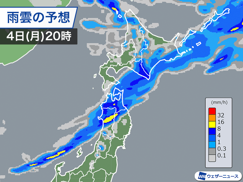 低気圧から延びる寒冷前線が南下し、発達した雨雲は東北地方に移動してきました。東北北部では日本海側から雨が降り始めていて、青森県や秋田県では1時間に10mm前後のやや強い雨となっている所もあります。