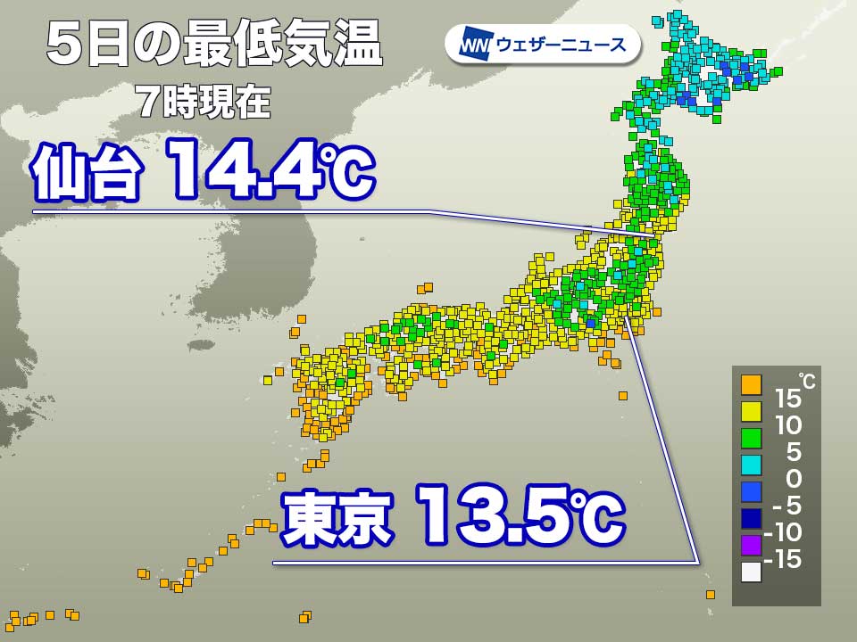 7時までの今朝の最低気温は、東京13.5℃、名古屋15.0℃、大阪15.7℃、福岡15.5℃です。東日本や西日本では昨日の朝よりも2℃から3℃ほど高い所が多くなっています。また、仙台では14.4℃と昨日の朝に比べると7℃以上も高くなりました。