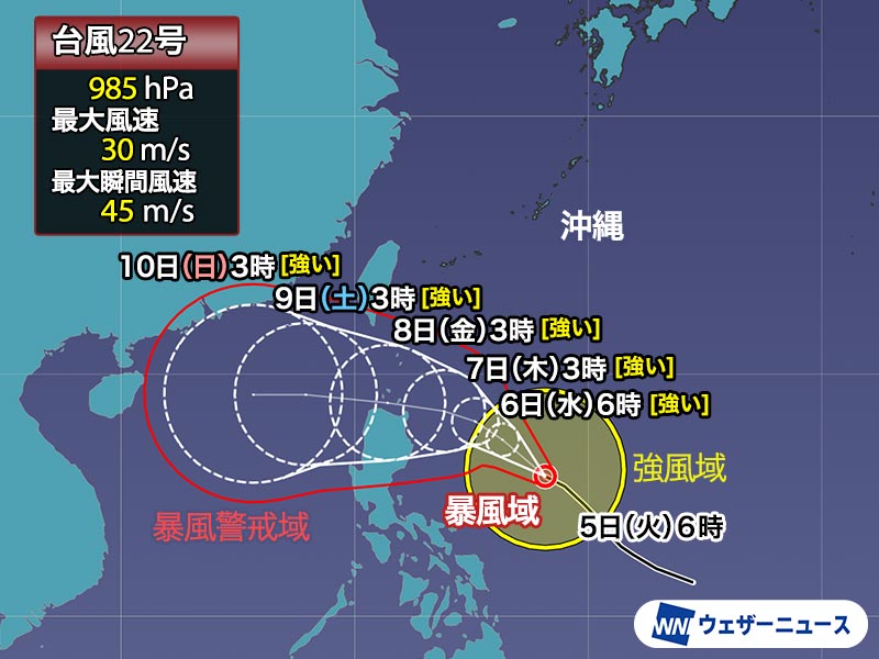 急速に発達して暴風域を伴い、今日には強い台風になる予想です。沖縄では間接的な影響で強風や高波、雨の影響が出る可能性があります。今後の情報にご注意ください。