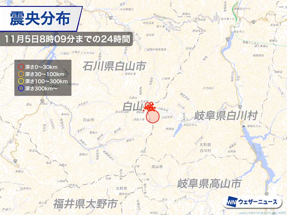 気象庁によると、白山では昨日11月4日(月)19時21分頃に、山頂付近のやや深部を震源とするM4.2(速報値)の地震が発生し、岐阜県高山市で震度2、富山県南砺市、石川県小松市・白山市・能美市、岐阜県飛騨市・白川村で震度1を観測しました。