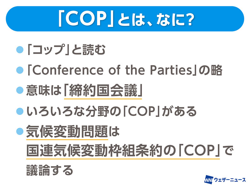 COPは通常「コップ」と読み、「Conference of the Parties」の略です。「締約国会議」と訳すことができ、平たくいえば、「条約を結んだ国々による会議」のことです。