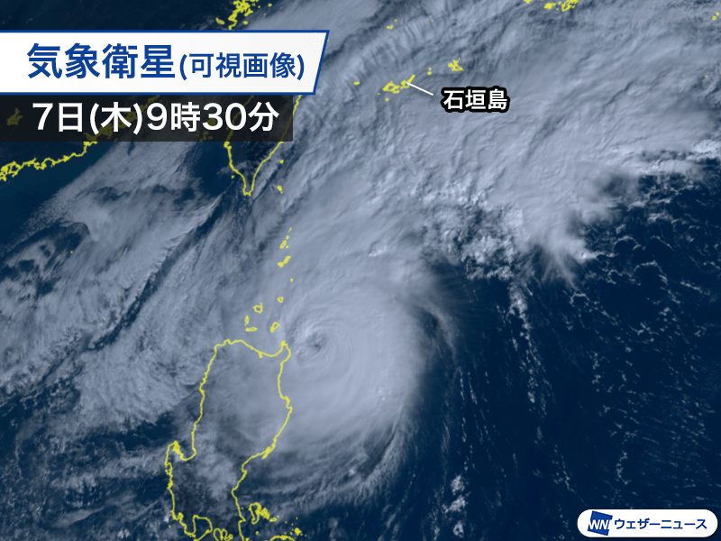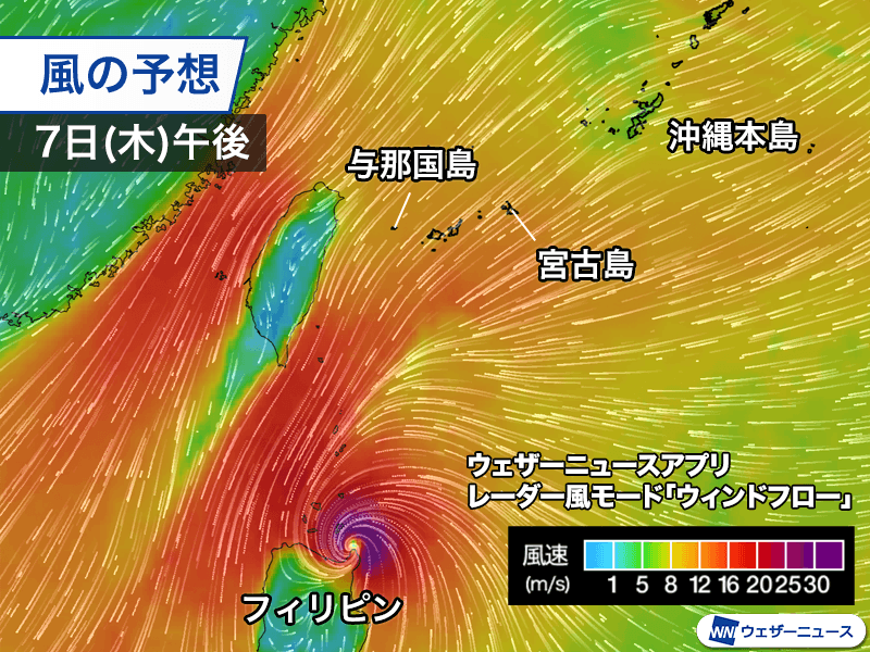 台風は沖縄から離れて通っているものの、大陸から張り出す高気圧の気圧差が大きくなっているため、強い風が続いています。最大瞬間風速は宮古島と与那国島で17.2m/sを観測しました。今日の午後にかけて15〜20m/sの強風が続く見込みです。