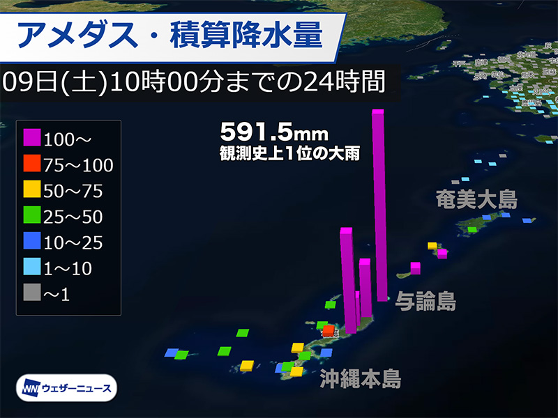 与論島では昨日8日(金)昼頃から断続的に雨が強まっていて、今日9日(土)10時までにアメダス与論島の24時間雨量は591.5mmに達しました。